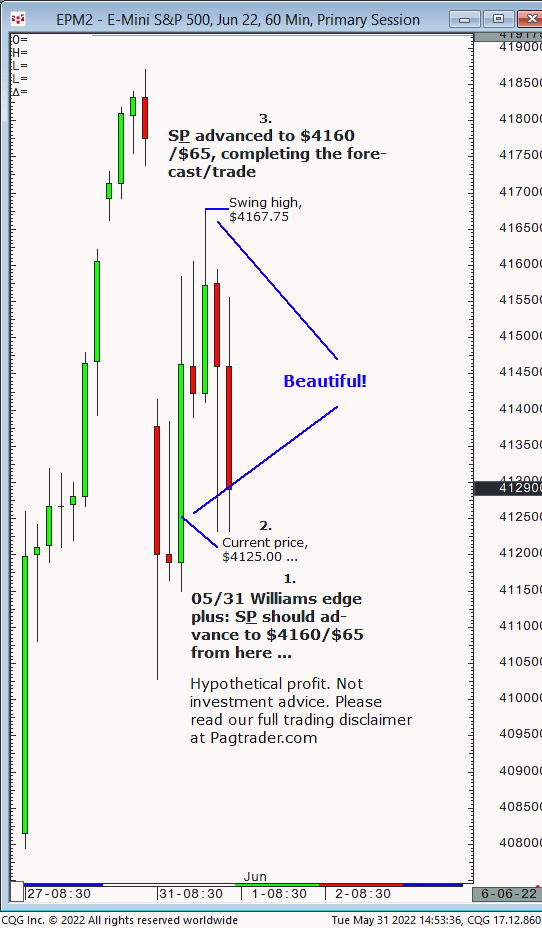 Tues., 05/31: S&P should advance from $4125 to $4160/$65. Result? The S&P advanced from $4125 to $4160/$65 (swing high, $4167.75)!