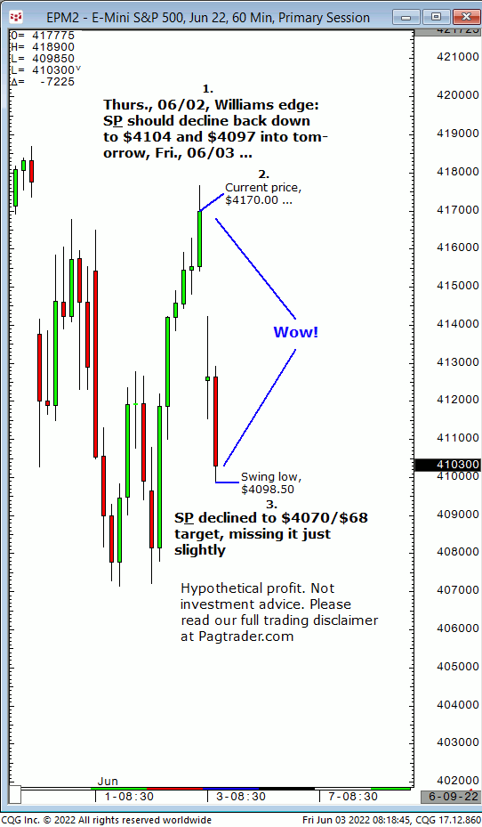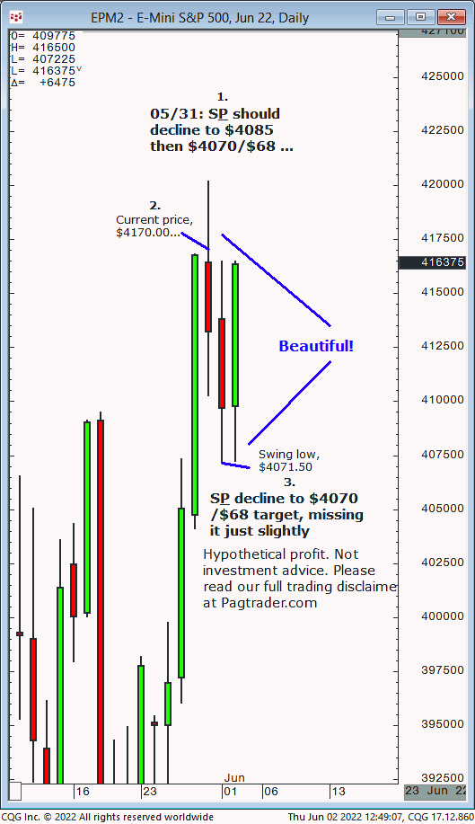 Thurs., 06/02: S&P should decline back down to $4104/$4097 into tomorrow, Fri., 06/03. Result? Today the S&P declined to $4104 and made a swing low of $4098.50!