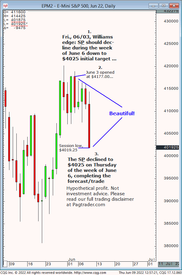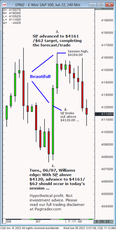 Tues., 06/07: With S&P above $4120, advance to $4161/$62 should occur in today’s session. Result? The The S&P advanced above $4120 and completed the $4161/$62 target the same day!