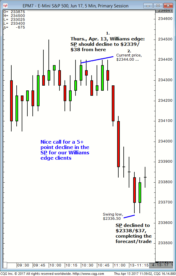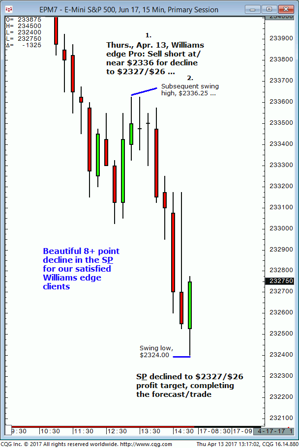 June S&P: 1. In Fridays (April 21) Williams edge live meeting it was noted that the June S&P (then trading at approximately $2350.00) was expected to test $2350/$51 late in the session. Therefore, any important decline would be buying territory for the advance and test of $2350/$51. 2. Subsequently, the June S&P declined to $2340.50 […]