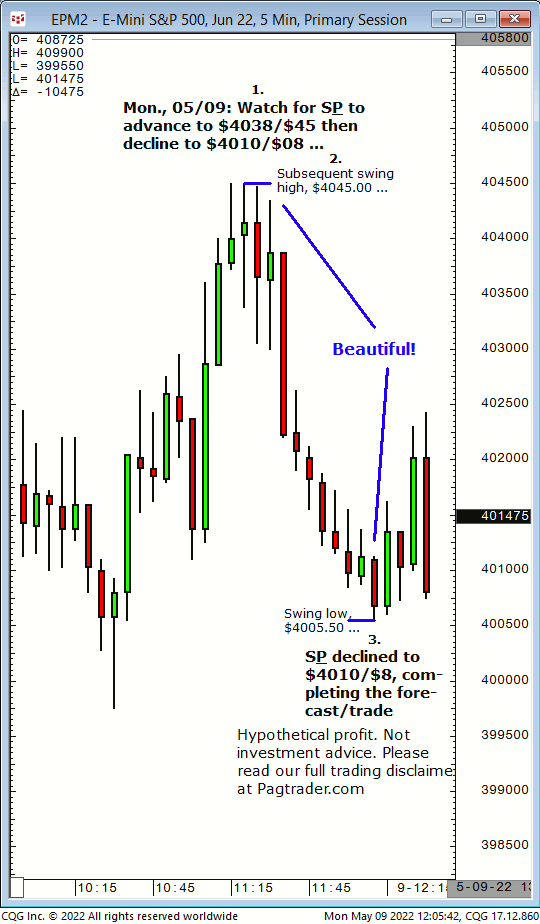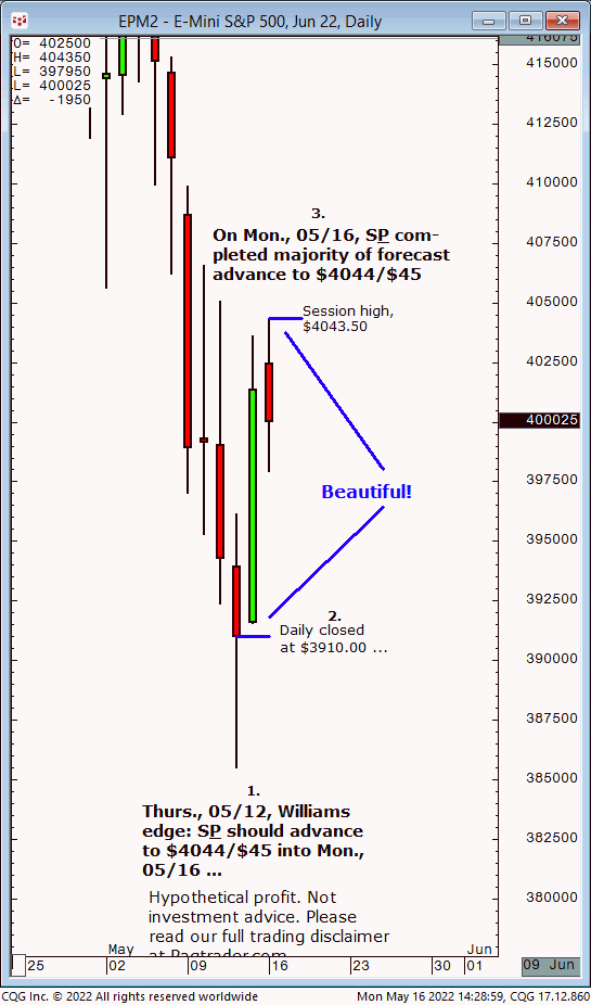 Thurs., 05/12: S&P should advance from $3910 to $4044/$45 into Mon., 05/16. Result? The S&P advanced to $4044/$45 (swing high, $4043.50) on Mon., 05/16!