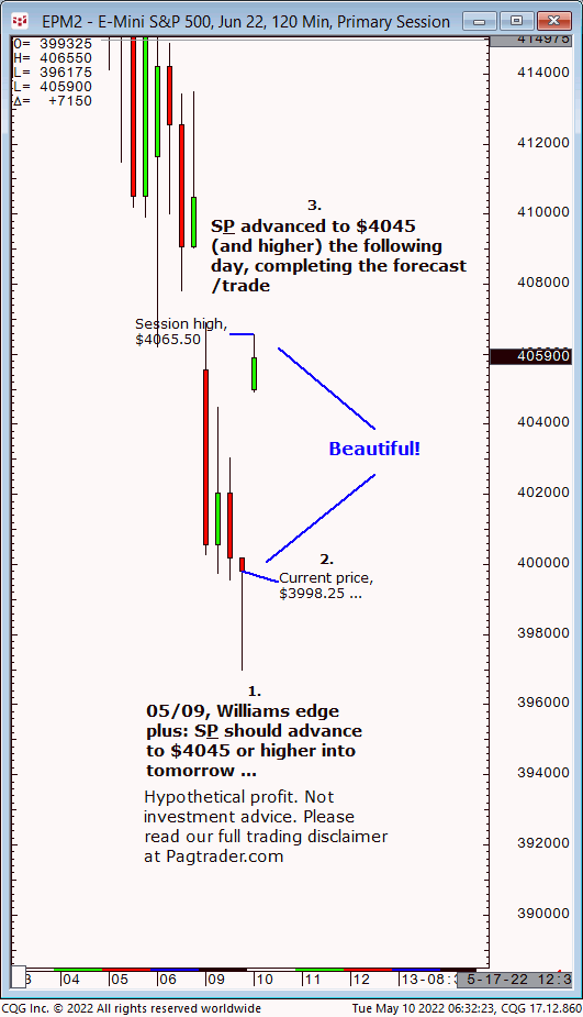 05/09: S&P should advance from $3998 up to $4045 or higher into tomorrow. Result? The S&P advanced to $4045 (and higher) the following day!