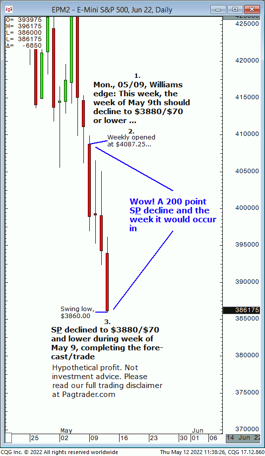Mon.,05/09: This week, the week of May 9, should decline from $4087.25 to $3880/$70 or lower. Result? By Thurs.,05/12 the S&P declined to $3880/$70 and lower!