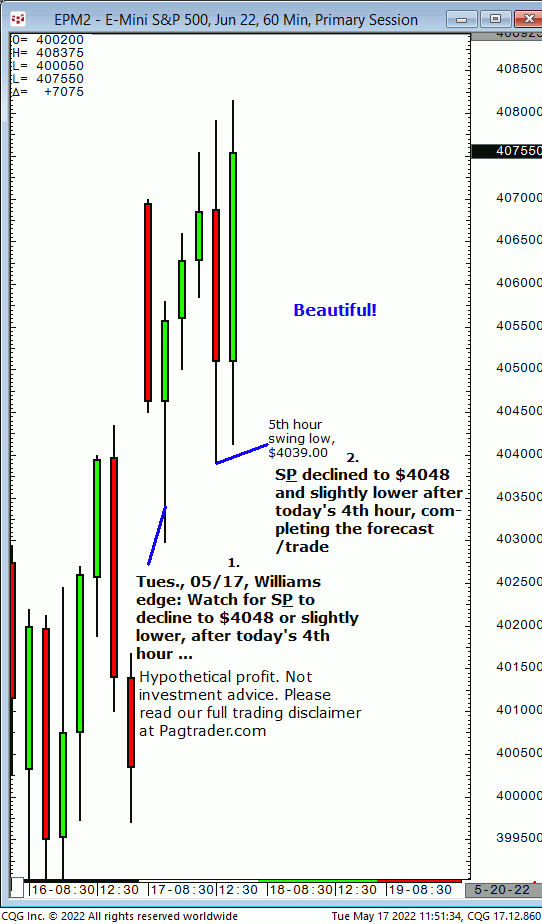 Tues., 05/17: Watch for S&P to decline to $4048 after today’s 4th hour. Results? The S&P declined in today’s 5th hour from $4079 down to $4048, completing the forecast (swing low, $4039)!