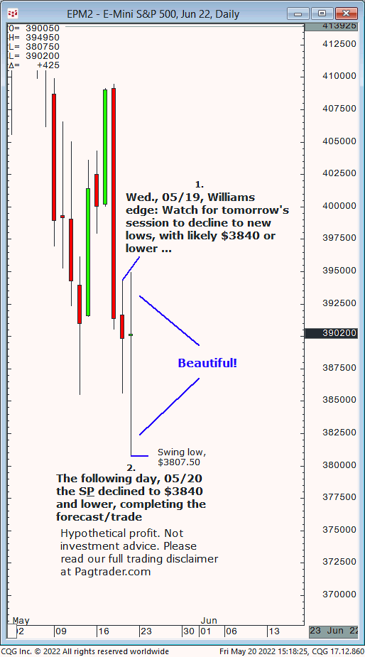 Wed., 05/19: Watch for tomorrow’s session to decline to new lows, with likely $3840 or lower. Results? The following day S&P broke to new lows and completed $3840 and lower!