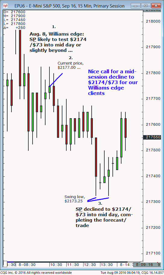 September S&P: 1. In yesterday’s (Monday, August 8) Williams edge S&P meeting it was noted that the September S&P (then trading at approximately $2177) is expected to decline into mid day (or slightly beyond) and test $2174/$73. 2. Subsequently, the September S&P declined and completed the $2174/$73 downside target into mid day and slightly beyond, […]