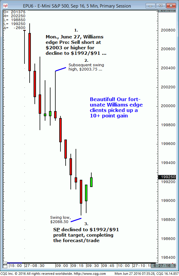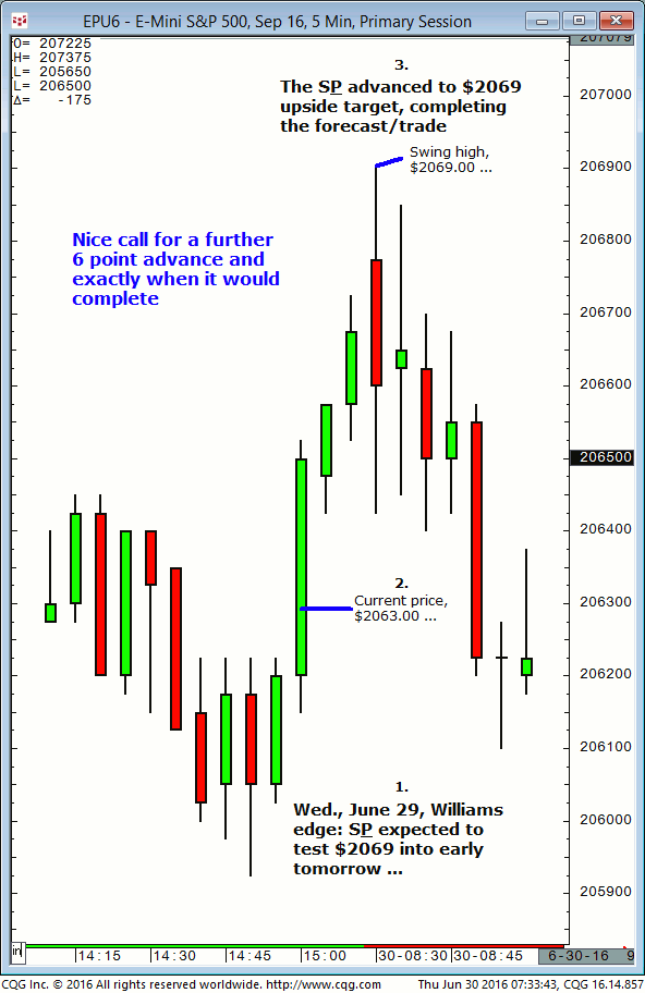 September S&P: 1. In today’s (Wednesday, July 7) 8:33 CST live messenger post it was noted that the September S&P (thentrading at approximately $2074) was expected to test $2069 (or lower) later in the session. 2. Subsequently, the September S&P declined and completed the $2069 downside target (today’s session low, $2068.50, so far). This successfully […]