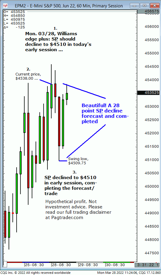 Mon., 03/28: S&P (currently at $4538) should decline to $4510 in today’s early session. Result? The S&P declined to $4510 in the 3rd hour (swing low, $4509.75)!