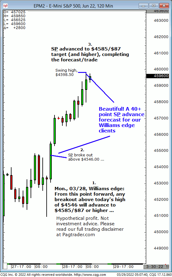 Mon., 03/28: From this point forward, any breakout above today’s high of $4546 will advance to $4585/$87, or higher. Result? The S&P broke out above $4546 and today completed the $4585/$87 target!