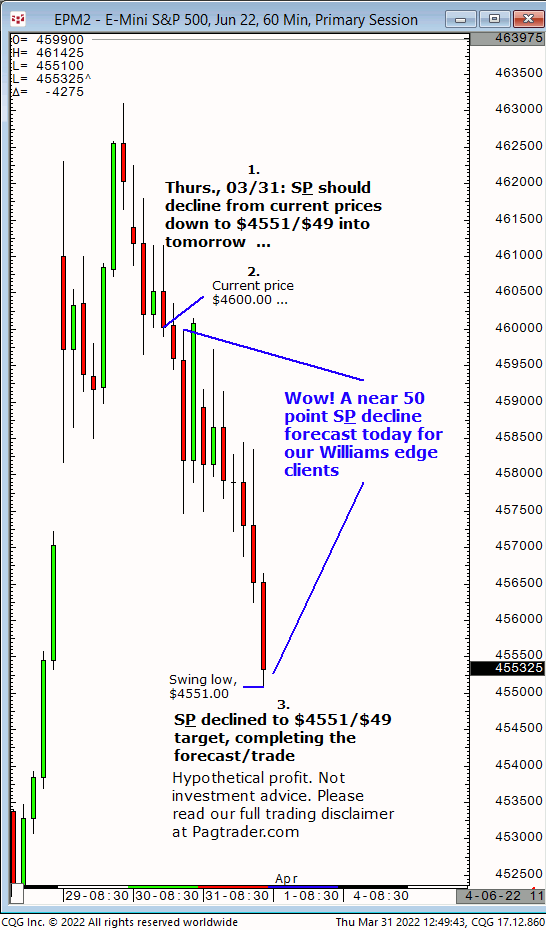 Thurs., 03/31: S&P should decline from current prices down to $4551/$49 into tomorrow. Result? The S&P declined from $4600 down to $4551 (and lower)!