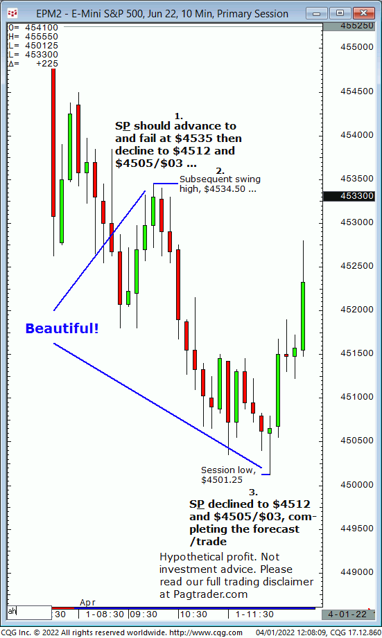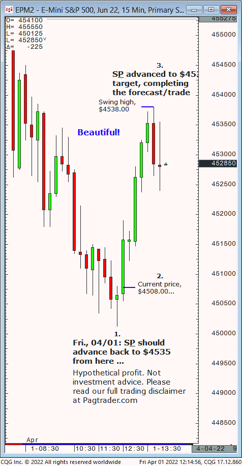 Fri.,04/01: S&P should advance to and fail at $4535 then decline to $4512 and $4505/$03. Result? The S&P advanced to $4534.50 then reversed lower to $4501/.25!
