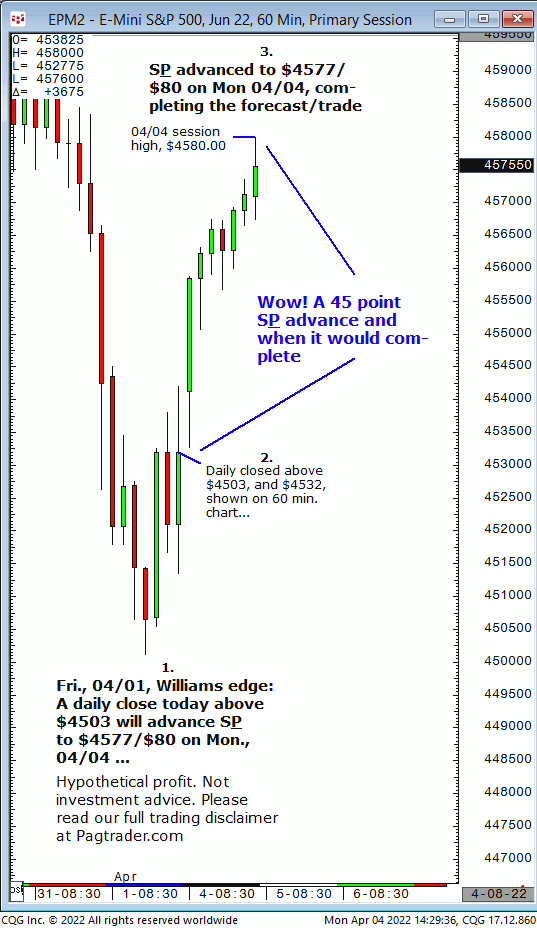 Fri., 04/01: A daily close today above $4503 will advance the S&P to $4577/$80 on Mon., 04/04. Result? The S&P closed at $4532 and today (Fri., 04/01) completed the $4577/$80 forecast target (session high, $4580)!