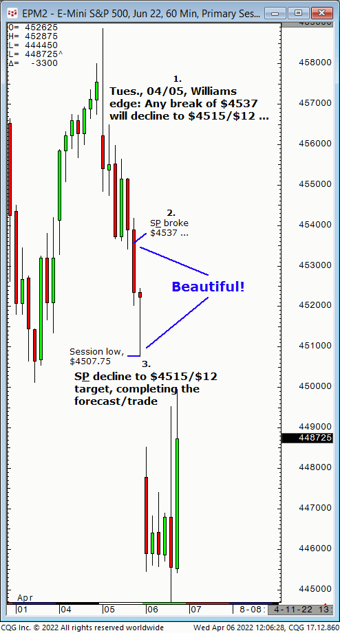 Tues., 04/05: Any break of $4537 will decline to $4515/$12. Result? The S&P broke $4537 and declined to $4515/$12 (swing low, $4507.75)!