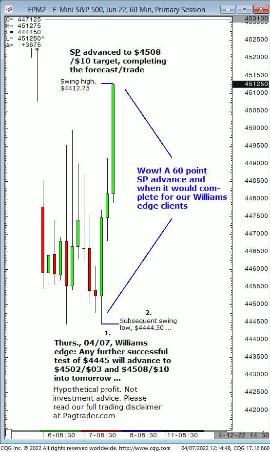 Thurs., 04/07: Any further successful test of $4445 will advance to $4508/$10 into tomorrow. Result? The S&P firmed up on $4445 and quickly completed $4508/$10!