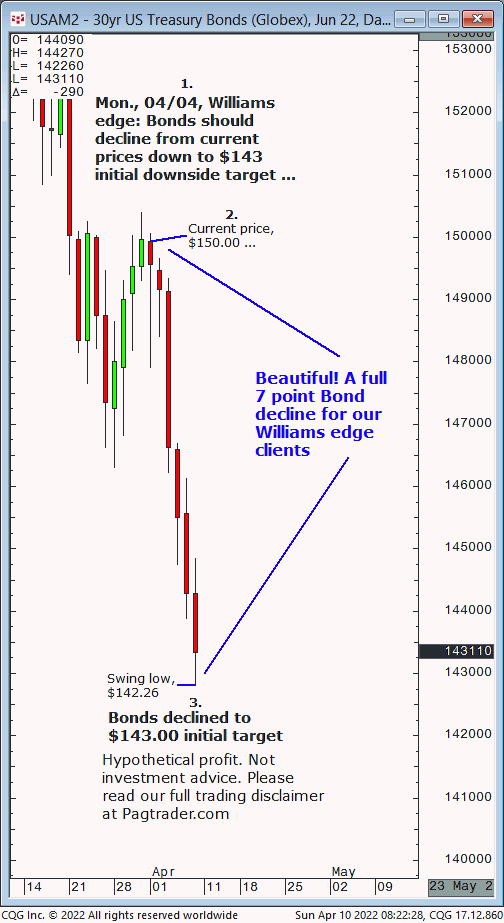 Mon., 04/04: Bonds should decline from current price of $150.00 down to $143.00 initial downside target. Result? Bonds just completed the initial $143.00 initial target!