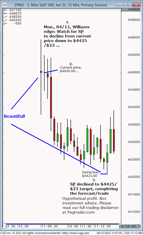 Mon., 04/11: Watch for S&P to decline from $4450 down to $4425/$23. Result? The S&P declined from $4450 down to $4425/$23!