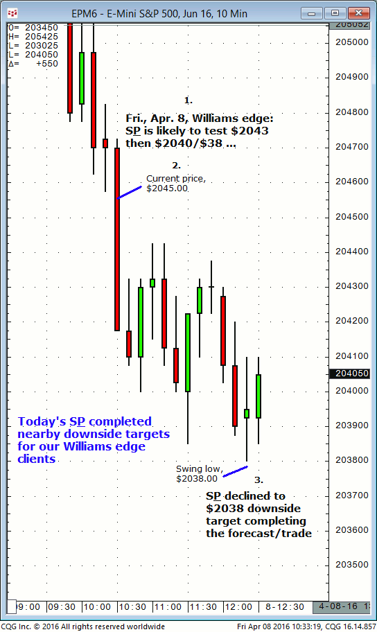 June S&P: 1. In yesterday’s (Monday, April 11) Williams edge Pro session it was noted that the June S&P (then trading at approximately $2043/$42) could be shorted at $2042 for a tradable decline to $2035. 2. Subsequently, the June S&P declined and completed the $2035 downside profit target (session low, $2033.50). This successfully completes the […]