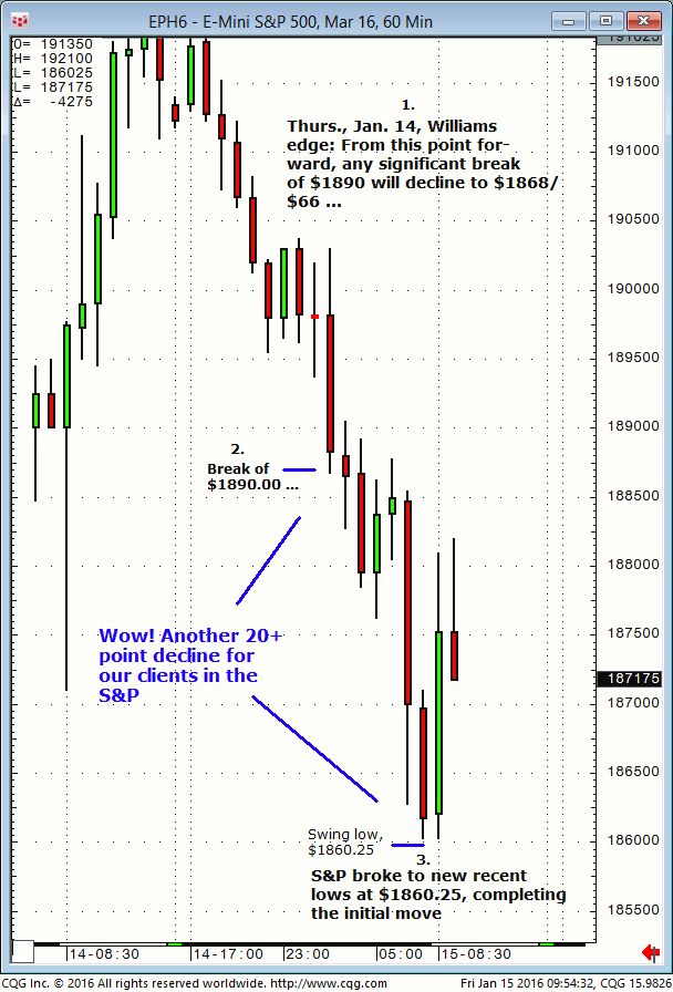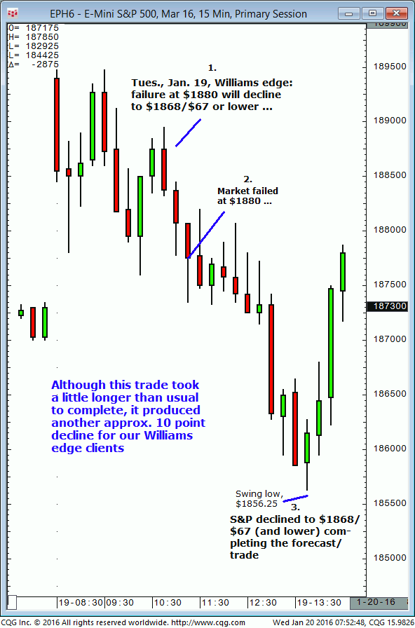 March S&P: 1. In today’s (Thursday, January 21) Williams edge live meeting and 10:10 CST live messenger post it was noted that any breakout above $1874 would test/attempt $1885/$86. 2. Subsequently, the market broke out above $1874 and attempted completion of the $1885/$86 upside target (today’s swing high, $1883.25). The market then reversed lower. Today’s […]