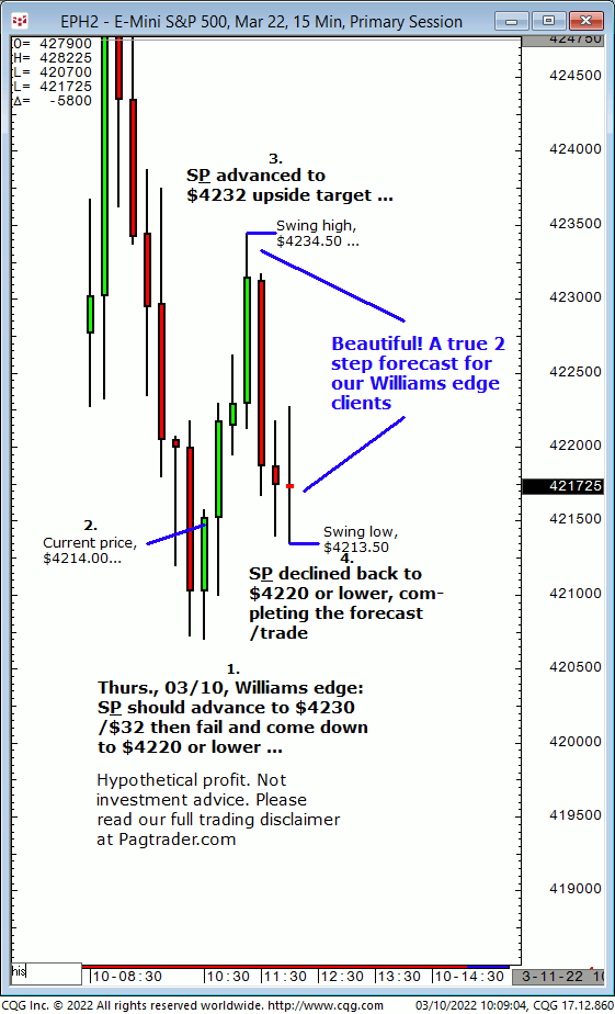 Thurs.,03/10: S&P should advance from current price to $4230/$32, then fail and come down to $4220 or lower. Result? The S&P advanced from $4214 to $4232 then declined to $4220 target!