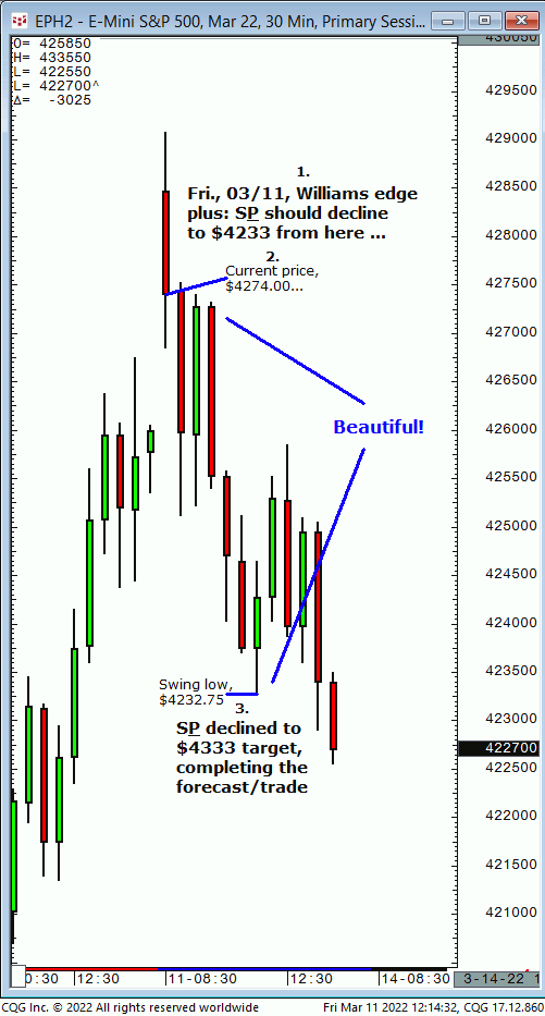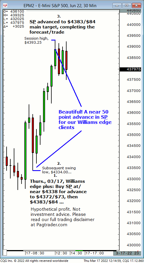 Thurs., 03/17: Buy S&P intraday at/near $4338 for advance to $4372/$73, then $4383/$84. Result? S&P made subsequent swing low of $4334, then reversed and completed the $4383/$84 main target!