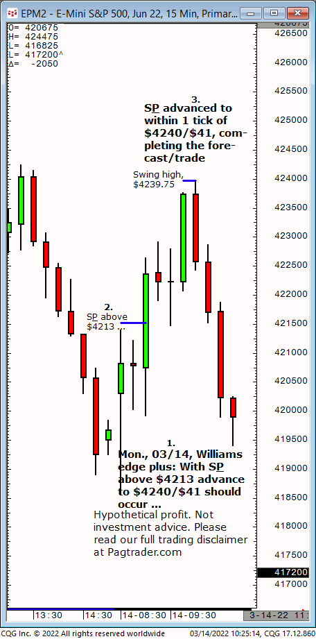 Mon.,03/14: With S&P above $4213, advance to $4240/$41 should occur. Result? The S&P advanced to within 1 tick of $4240/$41, at $4239.75!