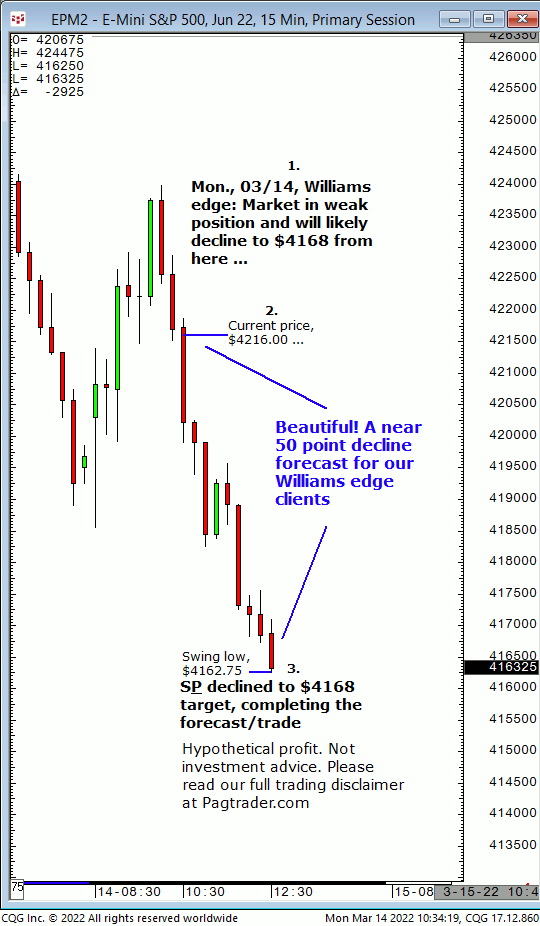 Mon.,03/14: Market is in weak position and will likely decline to $4168 from current price of $4216. Result? The S&P declined to $4168!