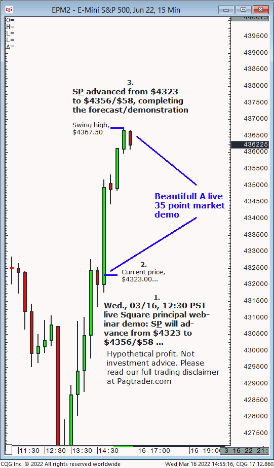 Wed., 03/16 Square principal live market demo: S&P will advance from $4323.00 to $4356/$58. Live result? The S&P advanced from $4323.00 to $4356/$58 (swing high, $4367.50)!