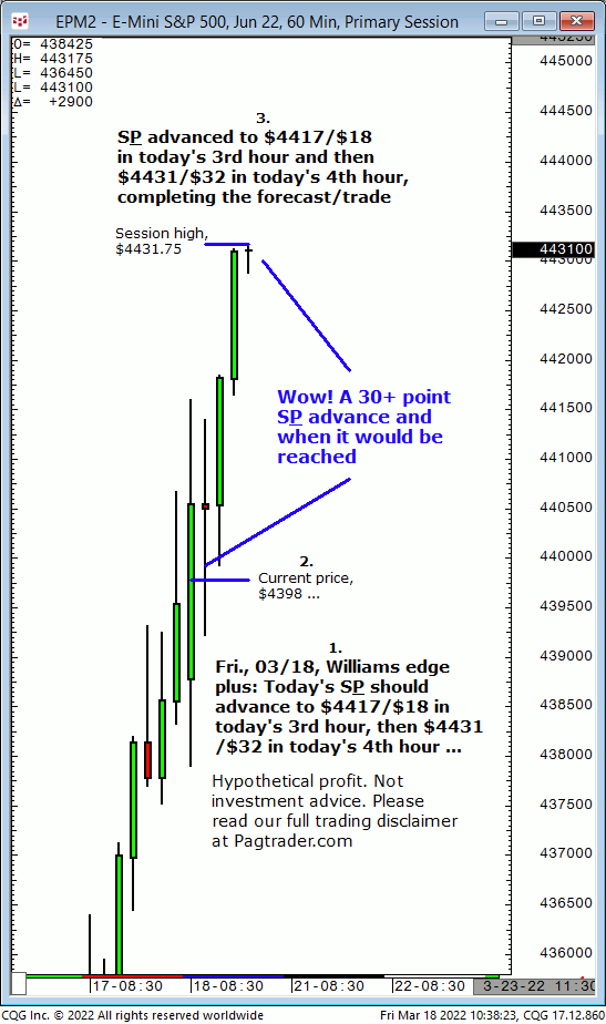 Fri.,03/18: Today’s S&P should advance from $4398 to $4417/$18 in today’s 3rd hour, then $4431/$32 in today’s 4th hour. Result? The S&P completed both targets in the 3rd and 4th hour respectively (4th hour swing high, $4431.75)!