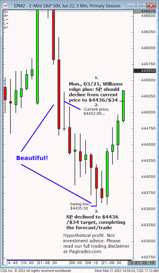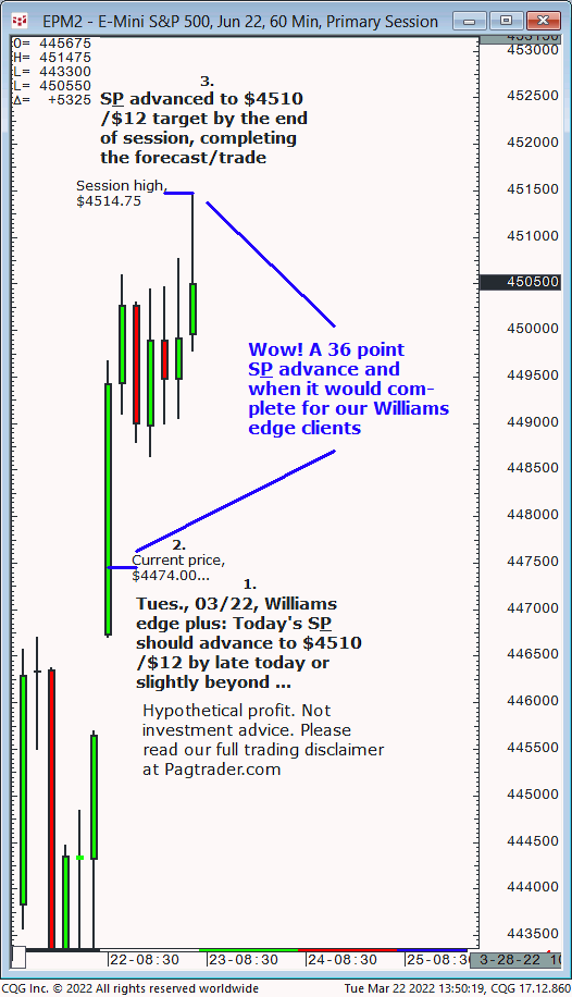 Tues., 03/22: Today’s S&P should advance from $4474.00 to $4510/$12 by late today or slightly beyond. Results? The S&P advanced to $4510/$12 late in the session (swing high, $4514.75)!