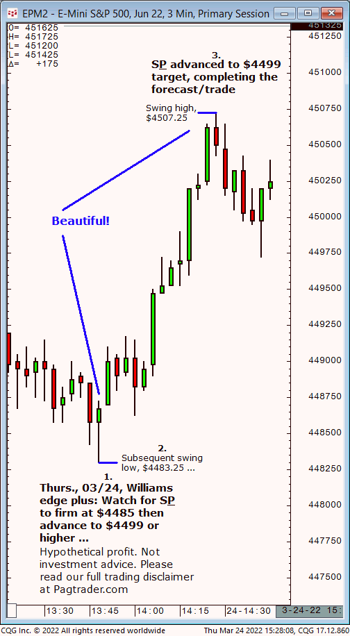 Thurs., 03/24: Watch for S&P to firm up at $4485 then advance to $4499 or higher. Results? S&P firmed up at $4485 then advanced to $4499 and higher!