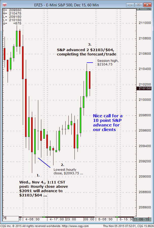 December S&P: 1. In today’s (Monday, November 9) Williams edge S&P meeting it was noted that any test of an hourly close above $2064/$63 would likely advance to $2074/$75 later in the session. 2. Subsequently, the December S&P made a session low of $2062 and closed the hour well above the $2063/$64 level. The market […]