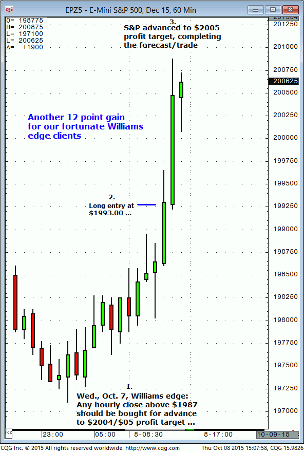 December S&P: 1. In Wednesday’s (October 7) 8:41 live messenger post it was noted that any hourly close above $1987 would prompt new long entry for advance to $2004/$05. This forecast was repeated in today’s (Thursday, October 8) 9:43 post, as well. 2. In today’s December S&P session the market closed hourly above $1987 (at […]