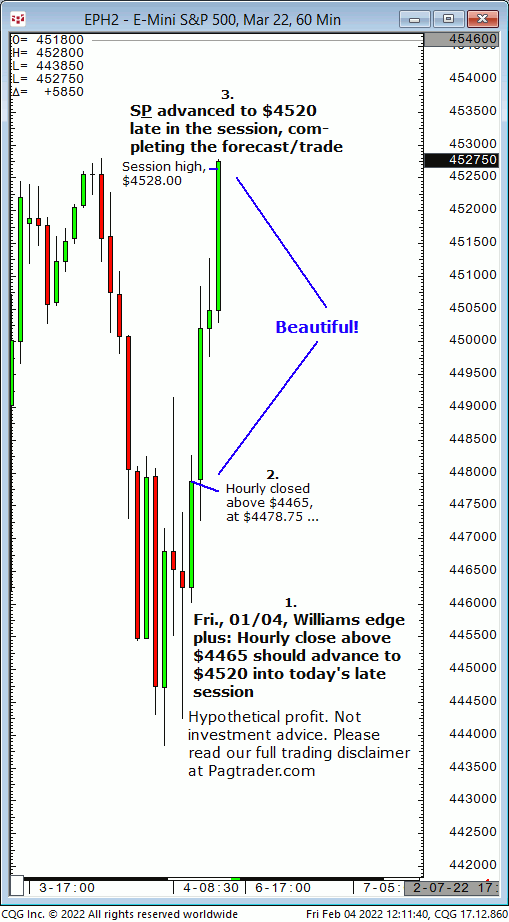 Fri., 02/04: Hourly close above $4465 will advance to $4520 into late session. Result? S&P closed hourly above $4465 (at $4478.75) and late session completed $4520!