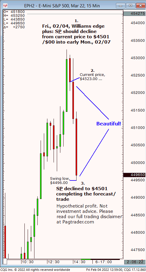 Fri., 02/04: S&P should decline from current price down to $4501/$00 into Mon., 02/07. Result? The S&P quickly declined from $4523 to $4501/$00!