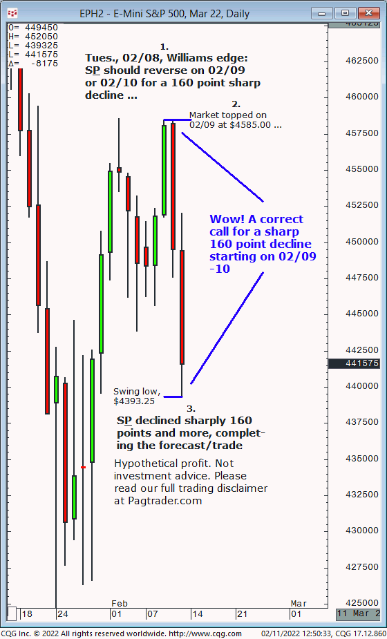 Tues., 02/08: S&P should reverse on 02/09-10 for a sharp 160 point decline. Results? The S&P topped on 02/09 at $4585 and declined 160 points and more in 2 days!