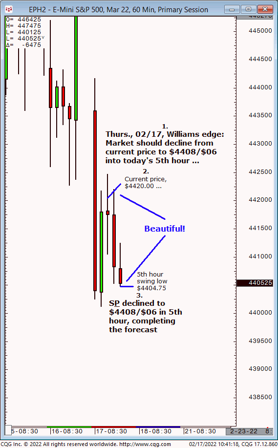 Thurs., 02/17: S&P should decline from current price of $4420 to $4408/$06 into today’s 5th hour. Result? The S&P declined to $4408/$06 in today’s 5th hour!