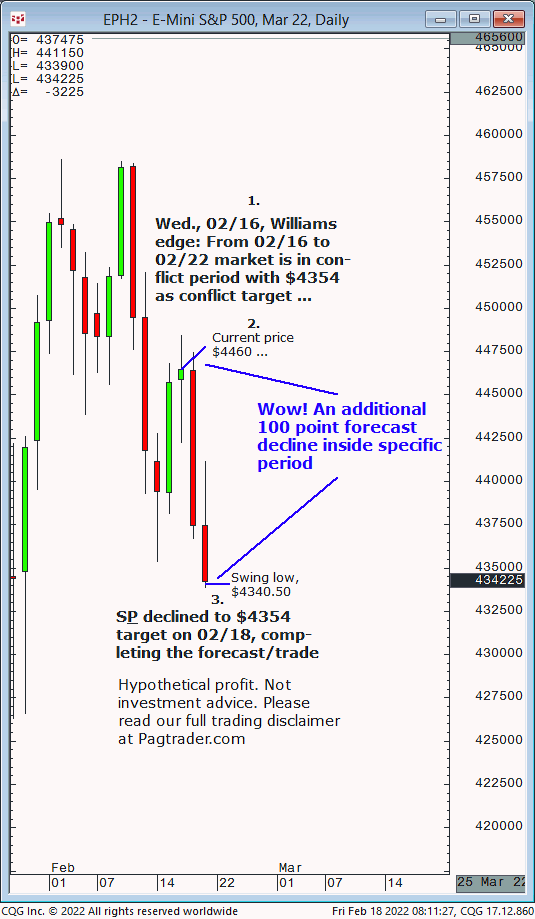 Wed., 02/16: From 02/16 202/22 market is in conflict period, with $4354 as downside conflict target. Result? S&P declined sharply inside those dates to $4354!