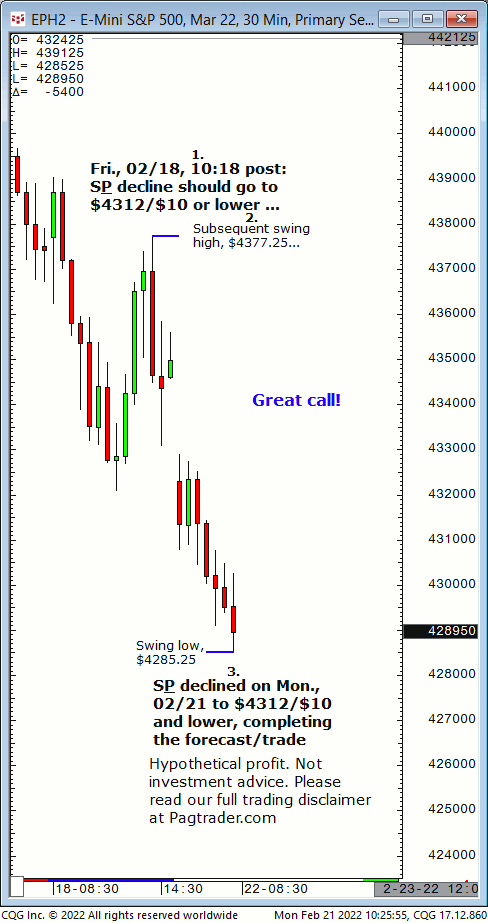Fri., 02/18, 10:18 PST: S&P decline should continue down to $4312/$10, or lower. Result? On Mon., 02/21 the S&P completed the $4312/$10 target!