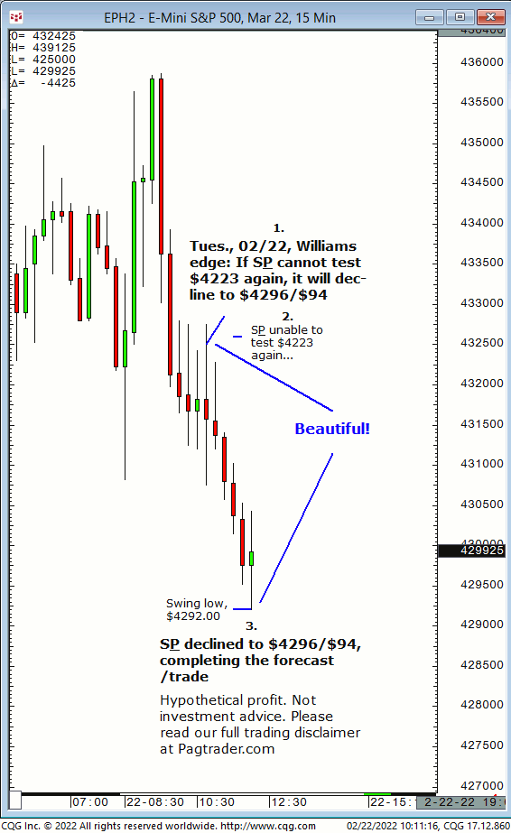 Tues., 02/22: If S&P cannot touch $4223 again, it will decline to $4296/$94. Result? S&P could not retest $4223 then quickly declined to $4296/$94!