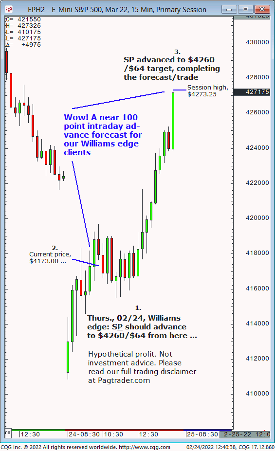Thurs., 02/24: S&P (currently at $4173) should advance to $4260/$64. Result? The S&P advanced powerfully and completed the $4260/$64 target (and higher)!