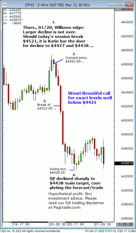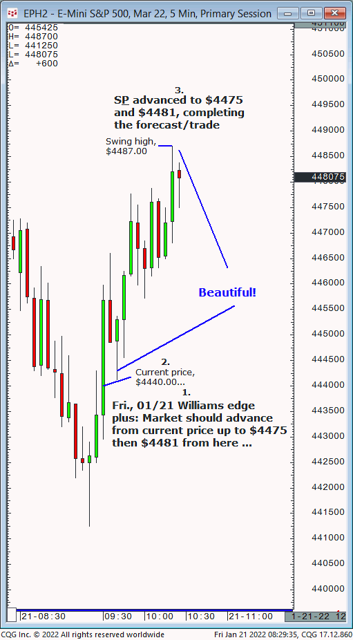 Fri., 01/21: Market should advance from $4440 up to $4475, then $4481. Result? The S&P advanced to $4475 and $4481!
