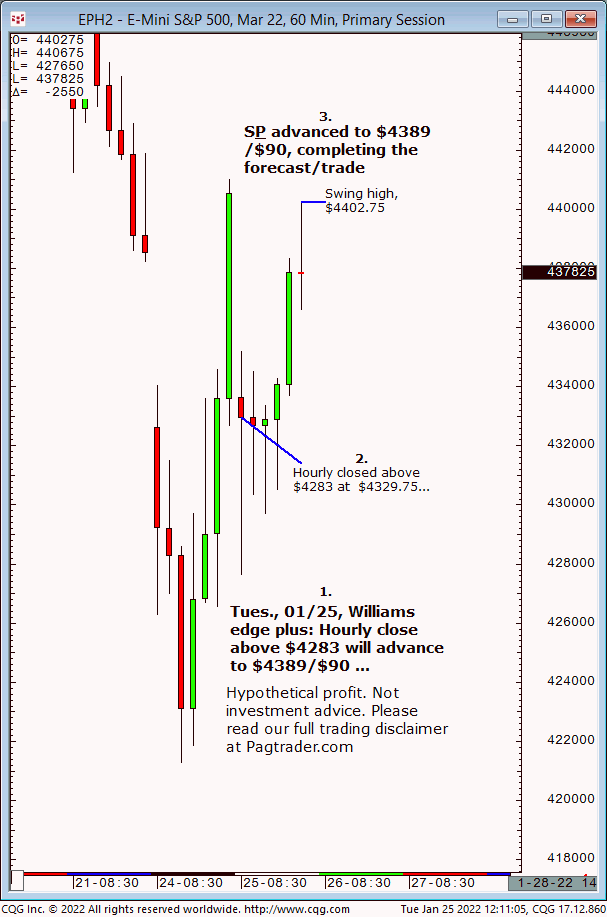 Tues.,01/25 early session: An hourly close above $4283 will advance to $4389/$90 today. Result? The S&P closed hourly above $4283 then advanced over 100 points to $4389/$90!