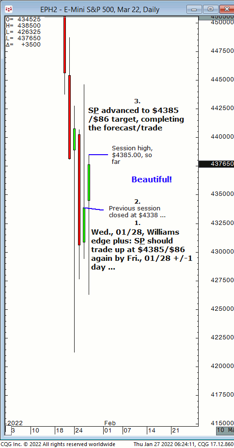 Wed., 01/28: S&P (then at $4338) should trade at $4385/$86 again by Fri., 01/28+/-1 day. Result? Gold completed $4385/$86 on Thurs., 01/27!