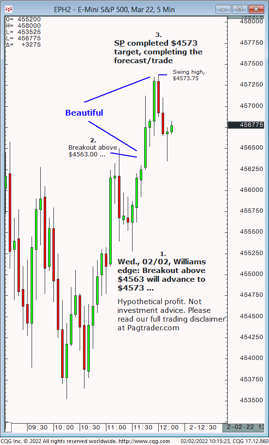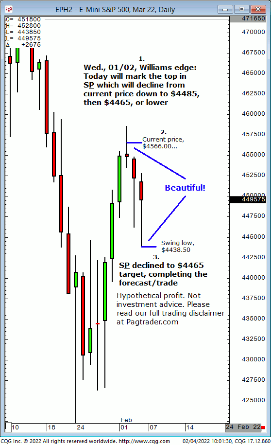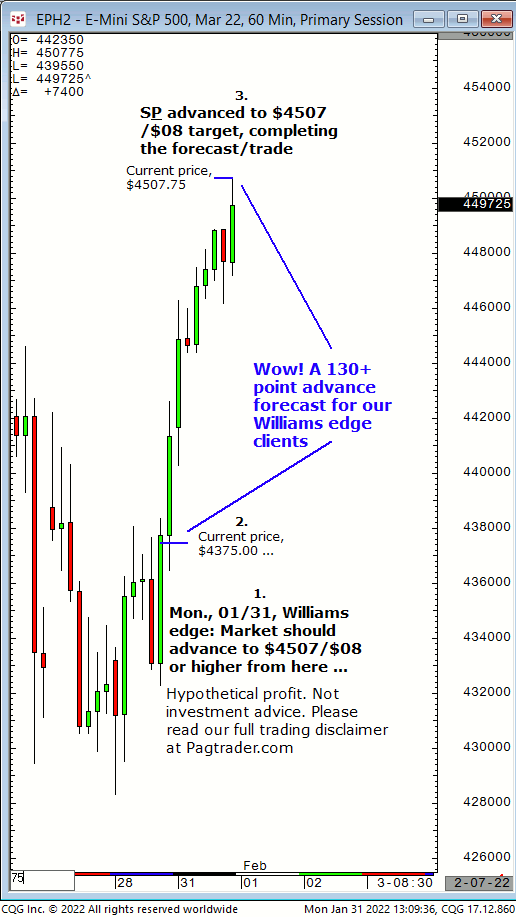 Mon.,01/31: S&P should advance from current price of $4375 to $4507/$8, or higher. Results? The S&P advanced to $4507/$08 (session high, $4507.75)!