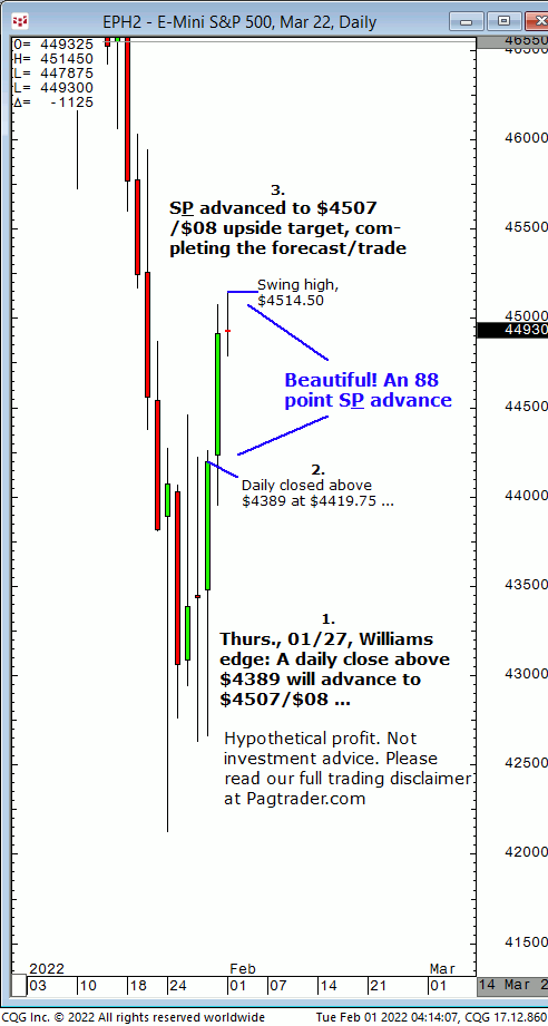 Correction to previous chart: Thurs., 01/27: A daily close above $4389 will advance to $4507/$08. Results? The S&P closed above $4389 (at $4419.75) then advanced to $4507/$08!