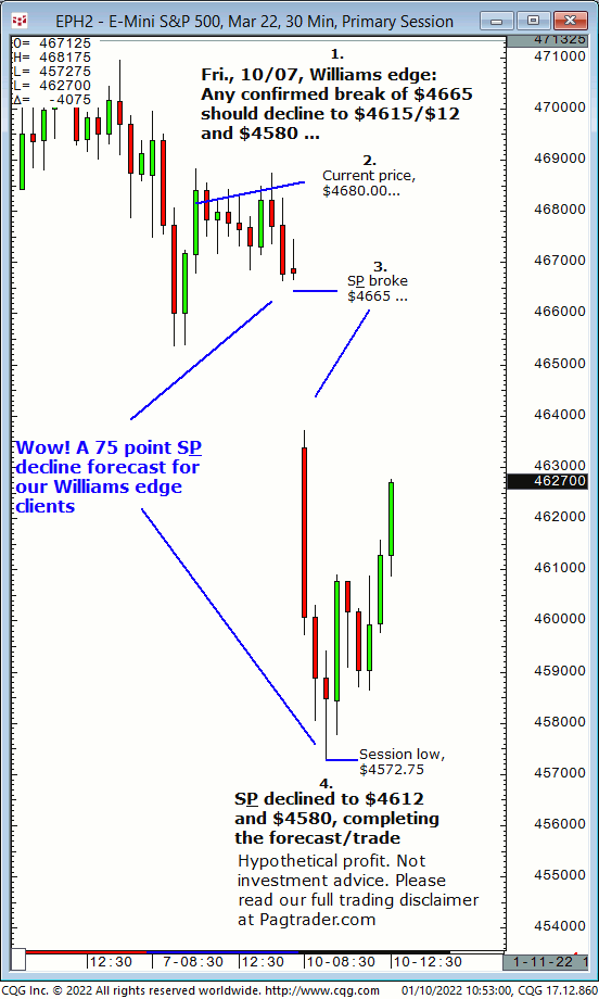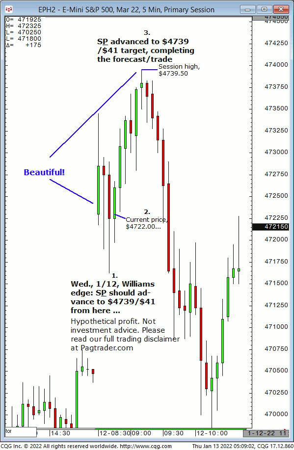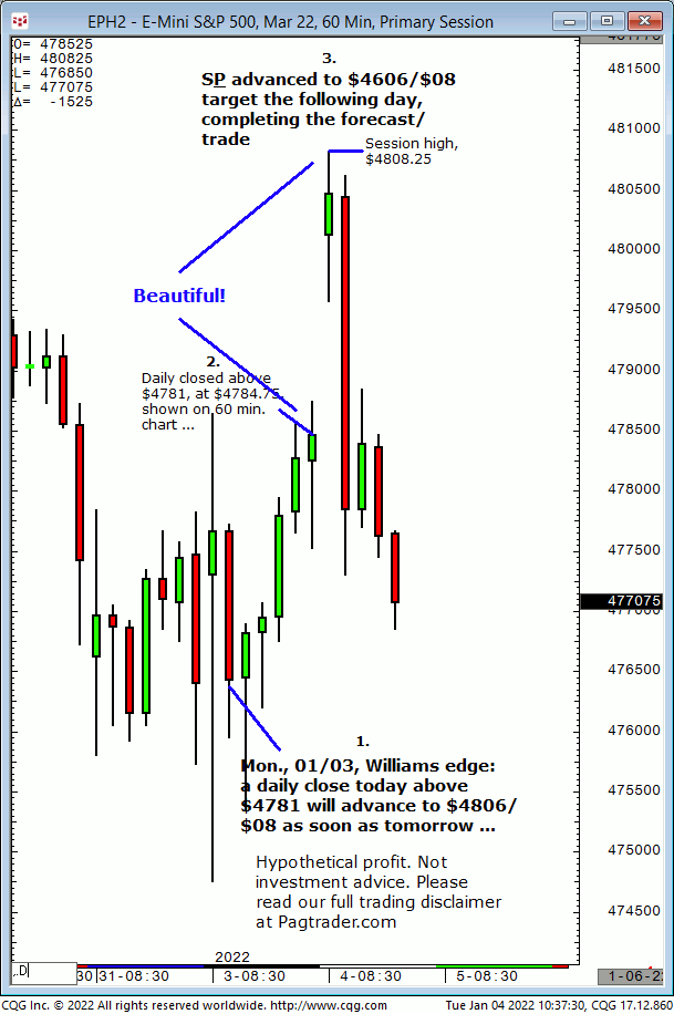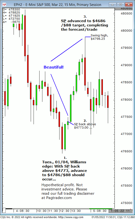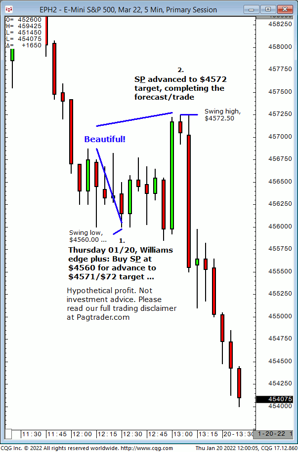 Thurs., 01/20: Buy S&P at $4560 for advance to $4571/$72 target. Result? The S&P made a subsequent swing low of $4558.50 then advanced to the $4572 target (swing high, $4572.50)!