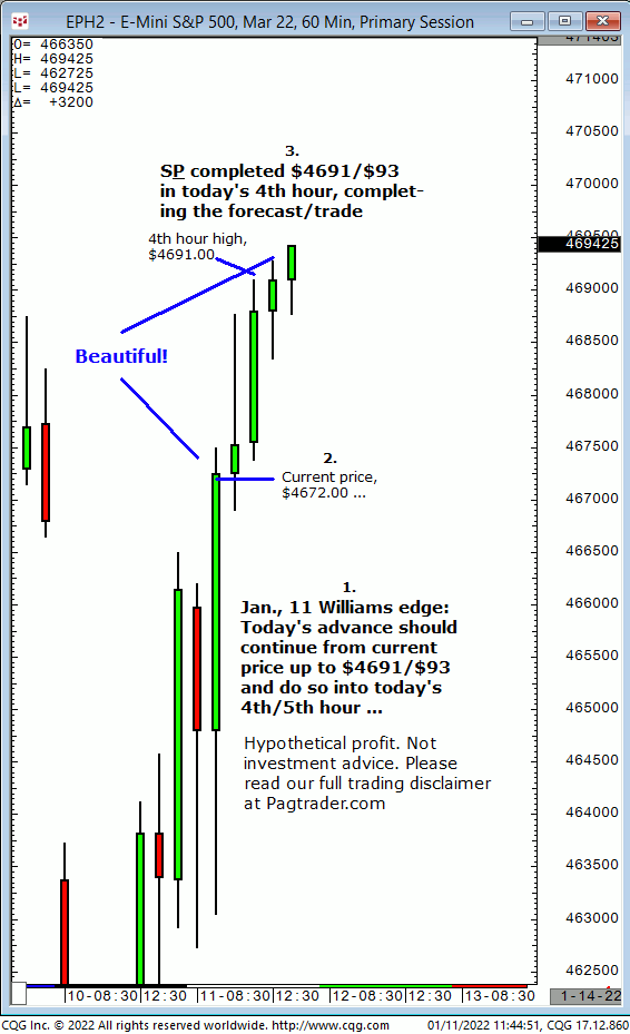 Tues., Jan., 11th: Today’s advance should continue from $4672 up to $4691/$93 and do so into today’s 4th/5th hour. Result? The S&P continued higher and in the 4th hour completed $4691!