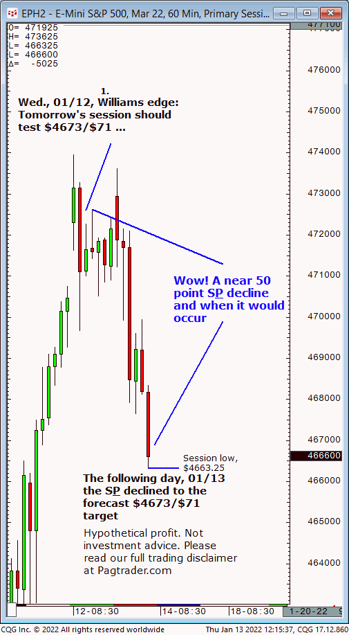 Wed.,01/12: Tomorrow’s session should decline to $4673/$71. Results? On 01/13 (today) the S&P declined to $4673/$71!