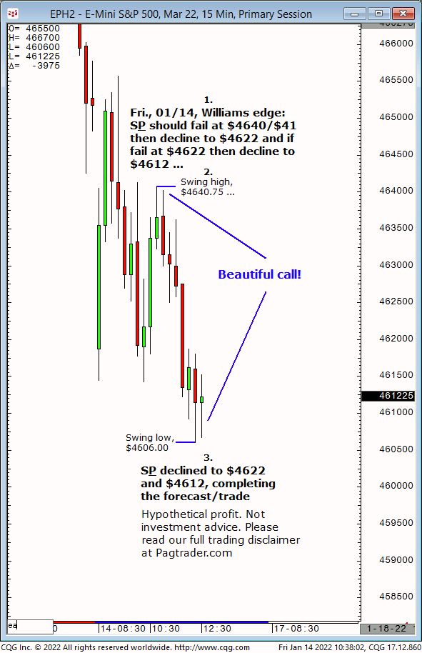 Fri.,01/14: S&P should fail at $4640/$41 then decline to $4622, and if fail at $4622, then further decline to $4612. Result? The S&P failed at $4640/$41 and completed both $4622 and $4612!