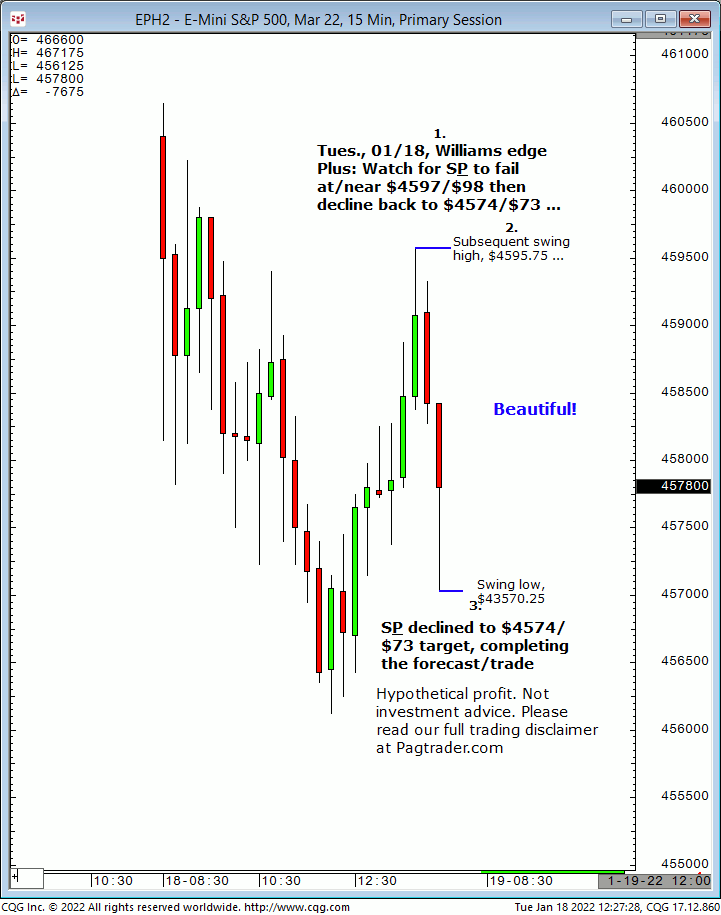 Tues.,01/18: Watch for S&P to fail at/near $4597/$98 then decline back to $4574/$73. Result? The S&P made a subsequent swing high of $4595.75 then quickly declined to $4574/$73!